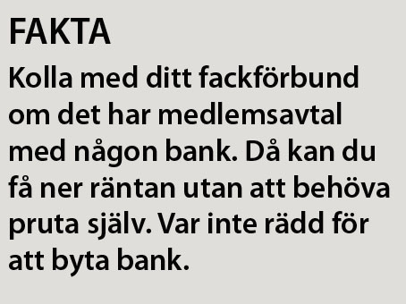 - Ett bra sätt för att få ned räntan är att kolla om ditt fackförbund har ett bolåneavtal med någon av storbankerna. Då får du ta del av en ränterabatt som ditt fack förhandlat fram för sina medlemmar.
